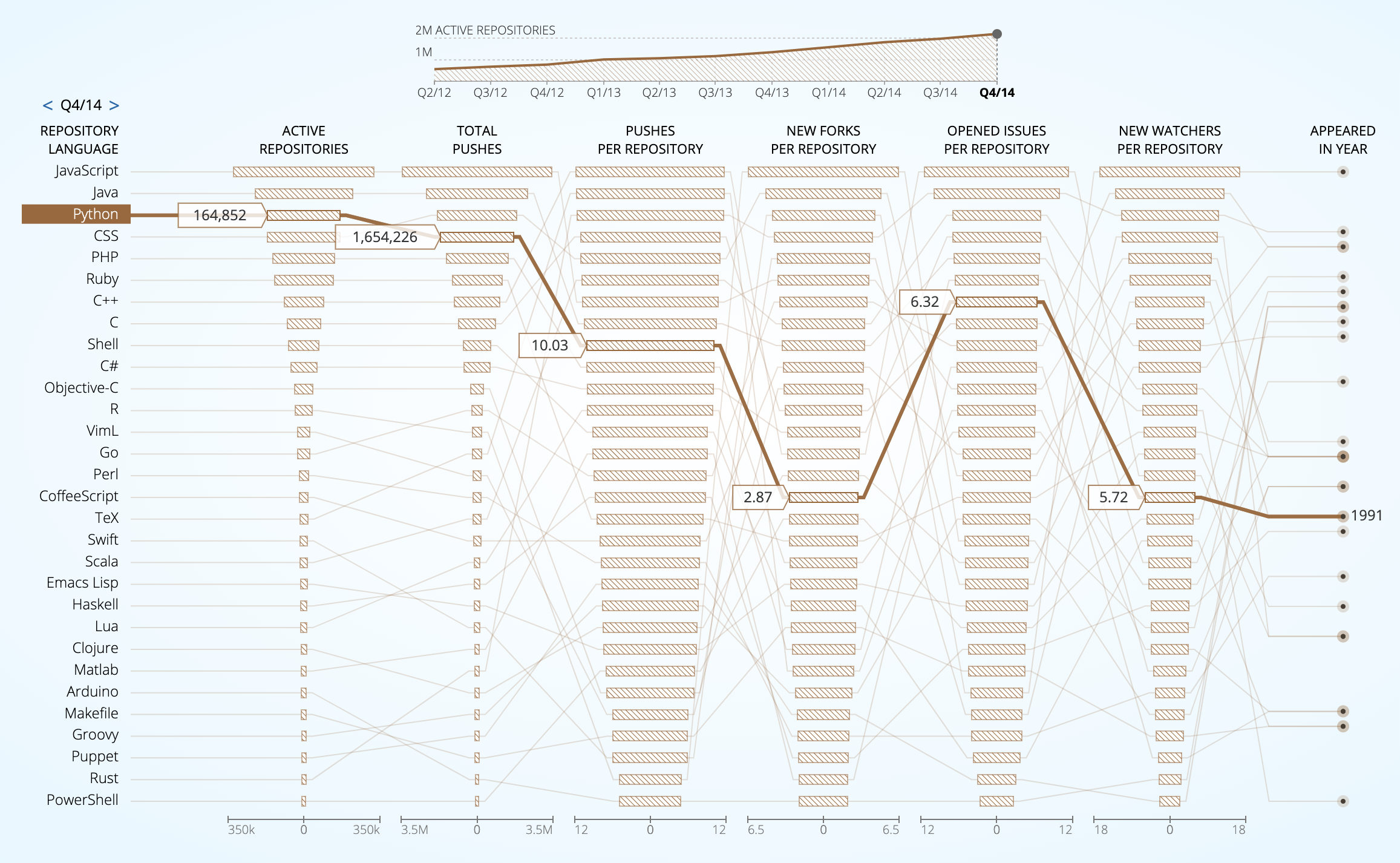 Độ phổ biến của 1 số ngôn ngữ lập trình được sử dụng trên các kho lưu trữ trên GitHub tính đến tháng 4/2014 theo Githut.